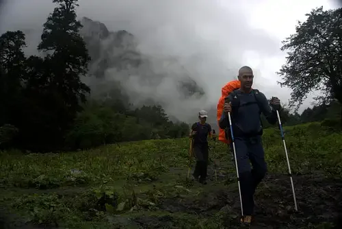 After a few days putzing around Kathmandu, we took a long jeep ride (10+ hours) to the first drop off point, Besishahar. This tiny village was on the start of the popular Manaslu & Annapurna circuit, so it had all the ammenities, it was quite comfy. Being previously acclimimated from my bicycle journey, the next task was a slow plod to basecamp during the rainy season. To keep myself sane and fit, I would go trail running in the evenings. The other climbers were not acclimated to the same standards, so some struggled a bit at Larke La (pass) 5100m.