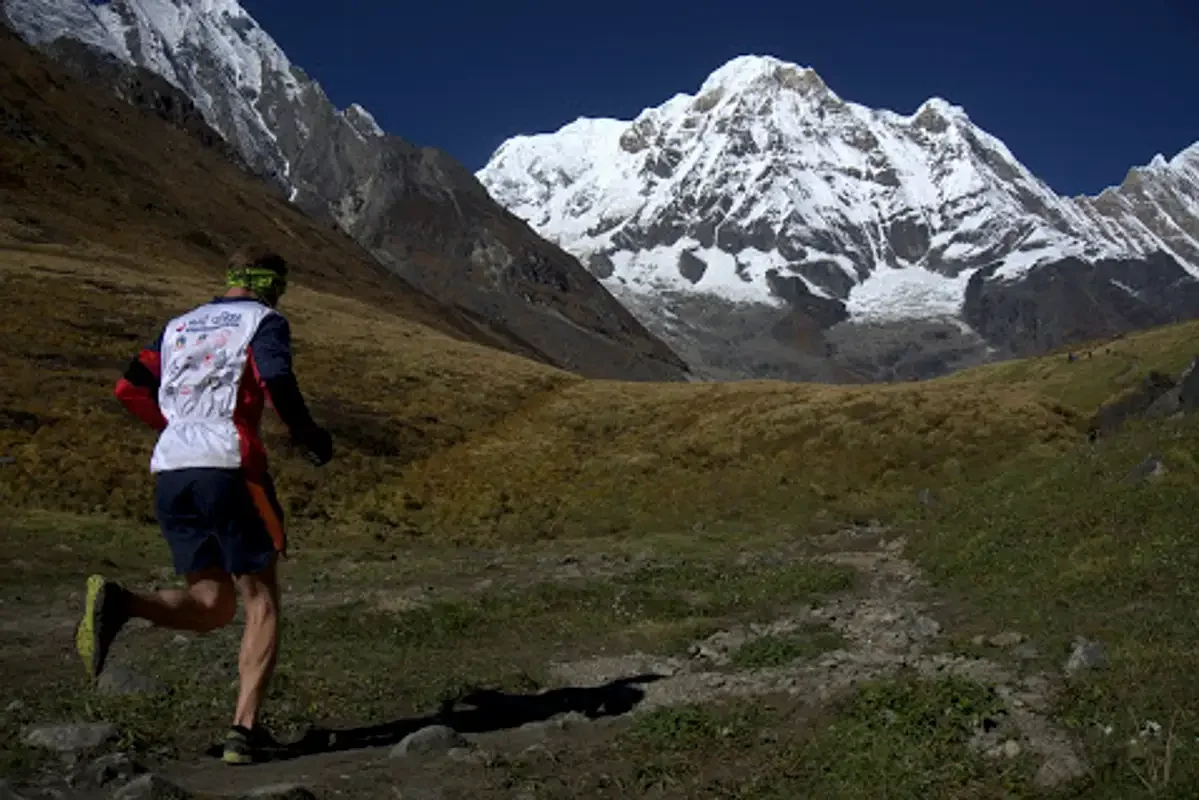 A trekker got a sweet shot of me trail running through the valley. This was a day run to Annapurna basecamp. I spent the night at the tea house to catch a view of the sunrise from Annapurna basecamp.