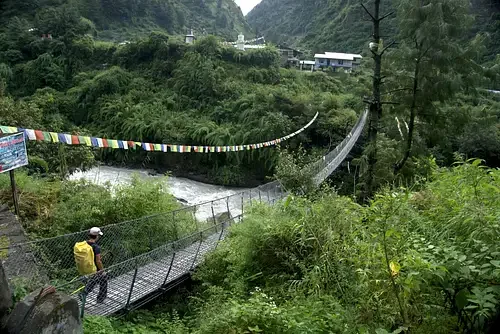 Trekking into basecamp on the Manaslu Circuit. Classic suspension bridge.