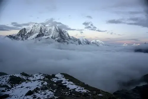 My plan of attack was to go from C2 to the summit and back down in a single push. Most people told me this was impossible, as it was nearly 1800m (6000') to the summit, but I felt confident and also that it was my only option to avoid getting too sick, too cold, or bogging myself down with weight. I had trained hard and tested my strategy in various ranges around the world. The ability to skip camps is a blessing, not a curse. In my opinion, sleeping high is the real killer. I spent alot of time between C3 & C2, just walking around and searching for lines. As a bonus, Camp 3 was usually above the cloud deck, and afforded beautiful views of Manaslu.