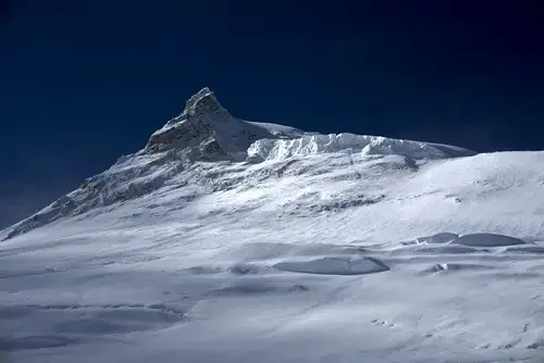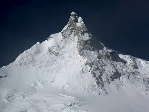 Manaslu summit pinnacle. The climbing route goes around the back on the right hand skyline. It’s easier than it looks.