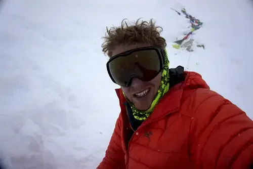As I was climbing and nearing the summit, small storms were rolling in and then fizzling out to beautiful bluebird conditions. It certainly gave me anxiety, but I kept faith that the storms would stay small and dissipate. The last 100m felt nearly impossible, I can recount 1 deep breath for every 10 steps.... Brutal. Finally, I reached the summit plateu alone & in poor shape... I was exhausted and ready to be off the mountain. Plus, it was cloudy, cold and miserable. After this experience, I had more respect for the 'Death Zone'. On top, there was still another 50m exposed traverse to reach the top. Ugh. I sucked it up and put one foot in front of the other, utterly exhausted. I was being extra cautious as to not fall on the exposed traverse into the void. Once I reached the summit, I took a quick break and can recall my mental state... Not good. I was definitely in a place I did not belong. This only meant one thing: Time to ski! :)