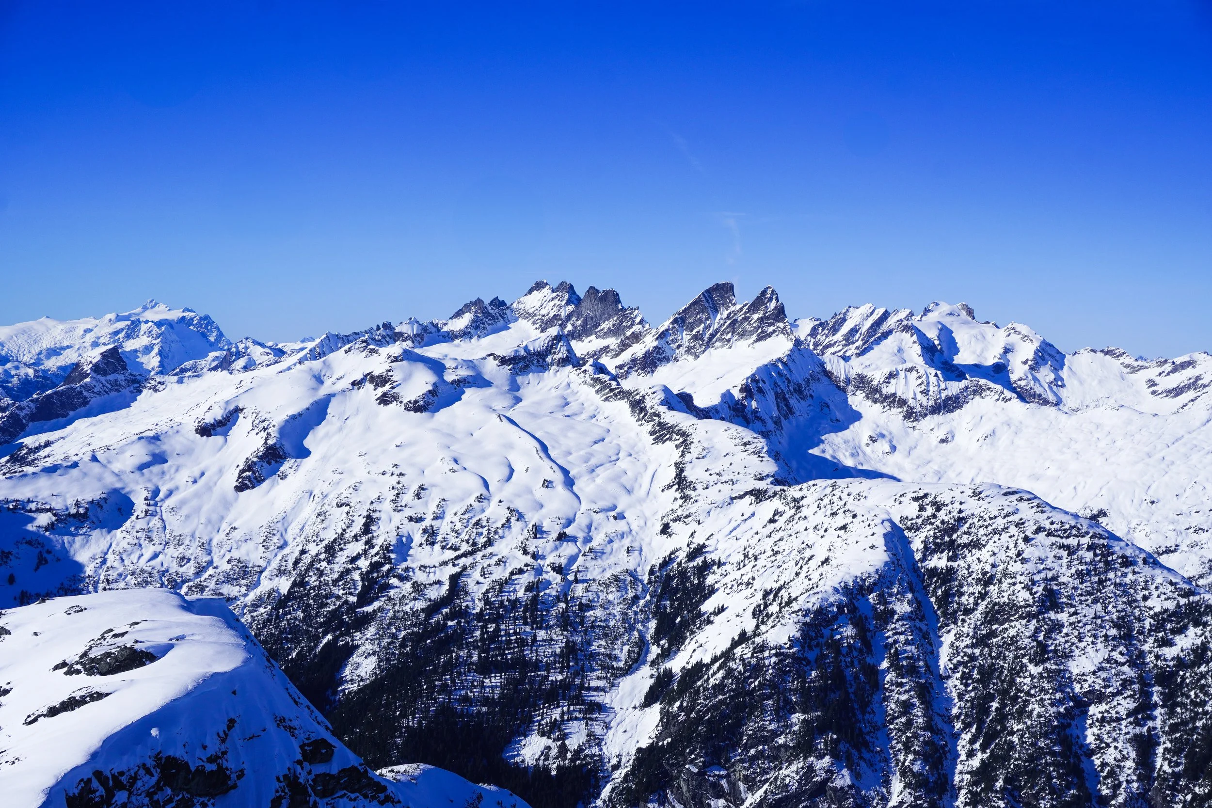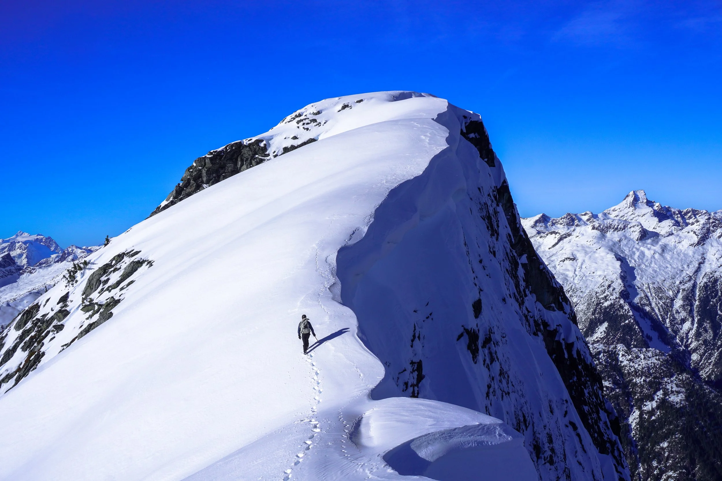Above the technical part of the ridge, it’s a straightforward & magical walk to the summit. On the right side is a massive cornice, with Davis’ massive North face in the shadow and Luna Peak looming in the background. On the left side you have the Pickets, Baker, Shuksan. We felt lucky to be in the position we were at so early in the season.