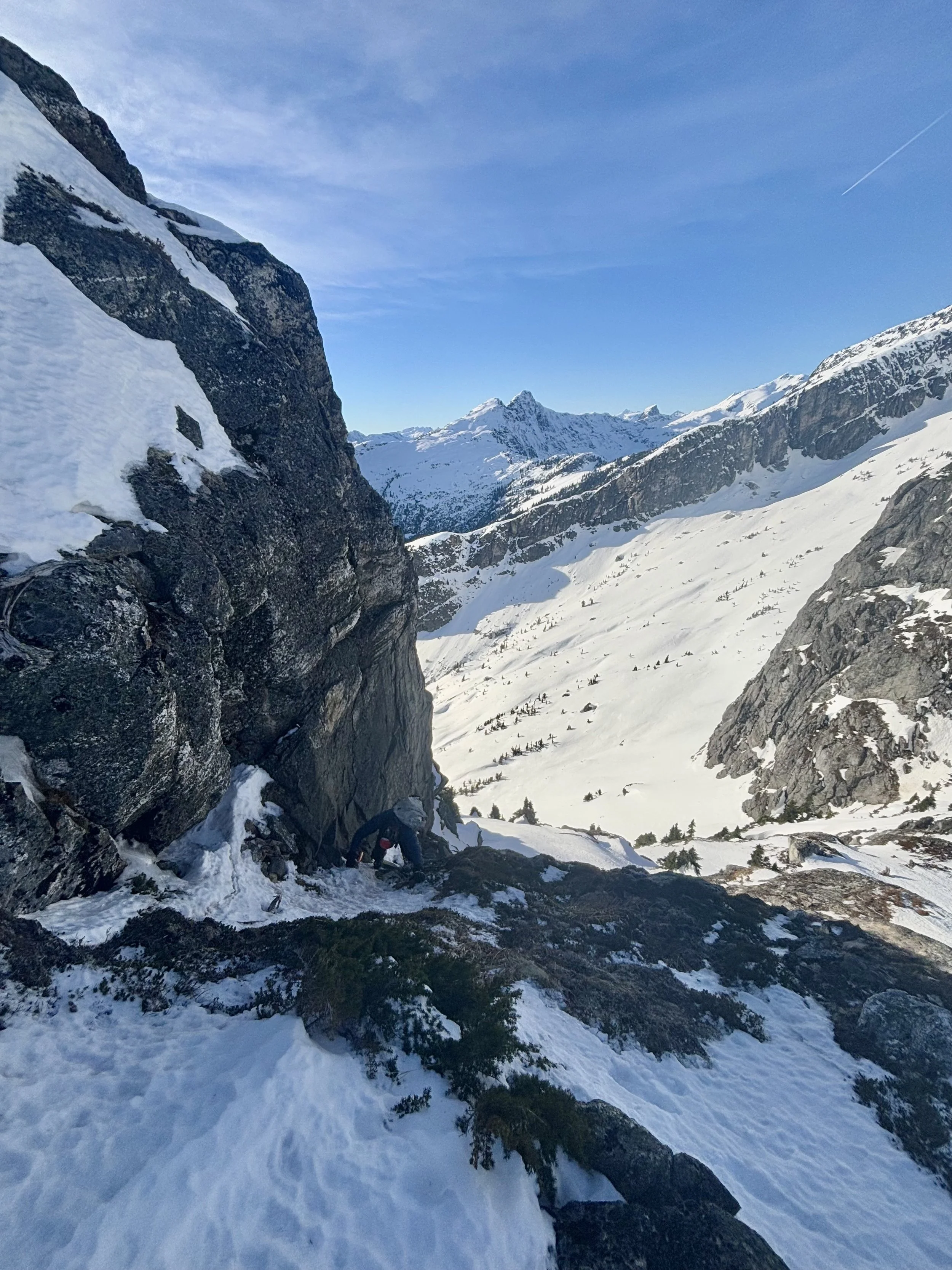 The first obstacle is dropping down to the notch below 5800’. The step down is exposed. It was a mixture of steep snow and rock slabs, but it goes with route finding and careful footing.