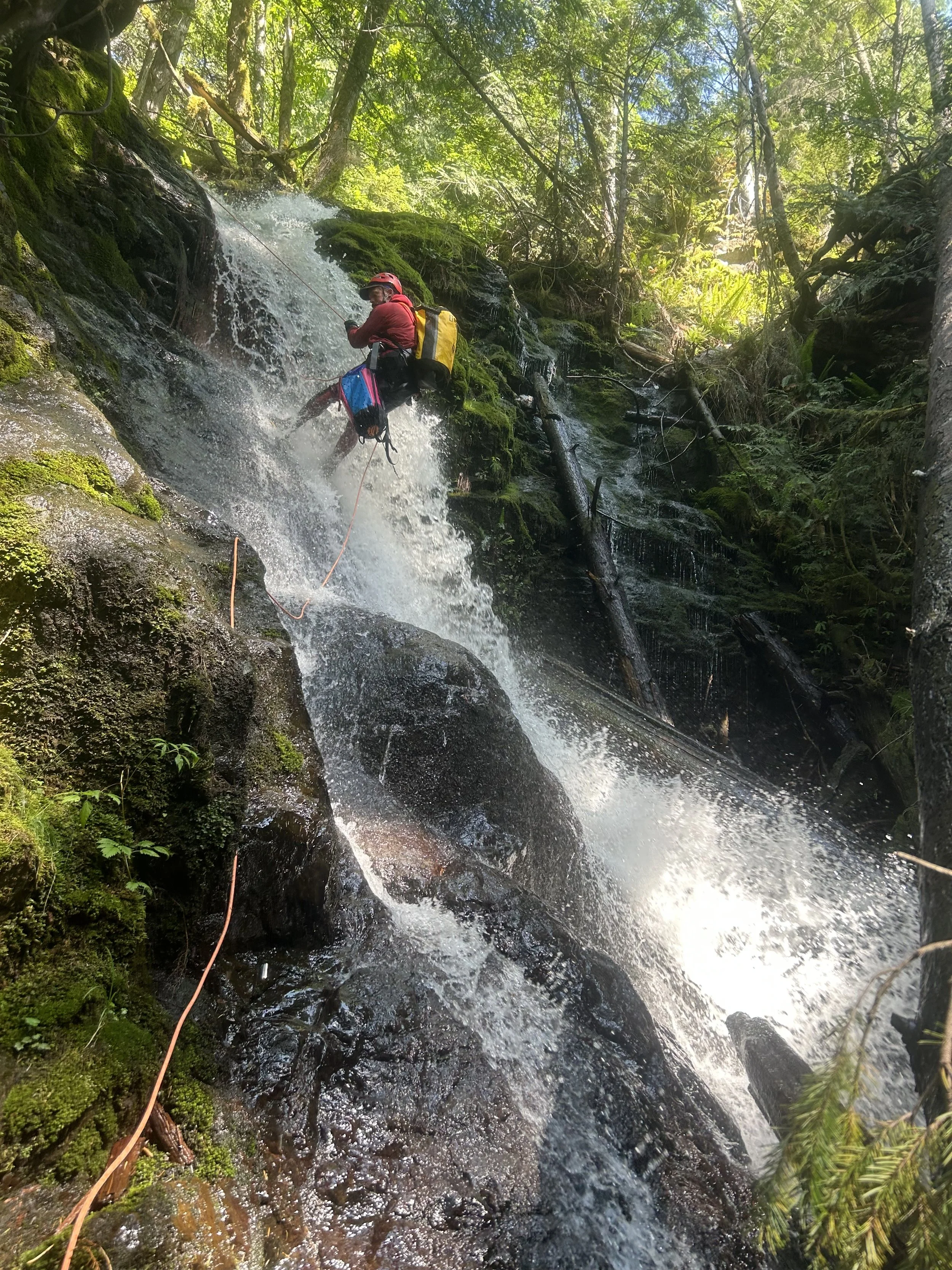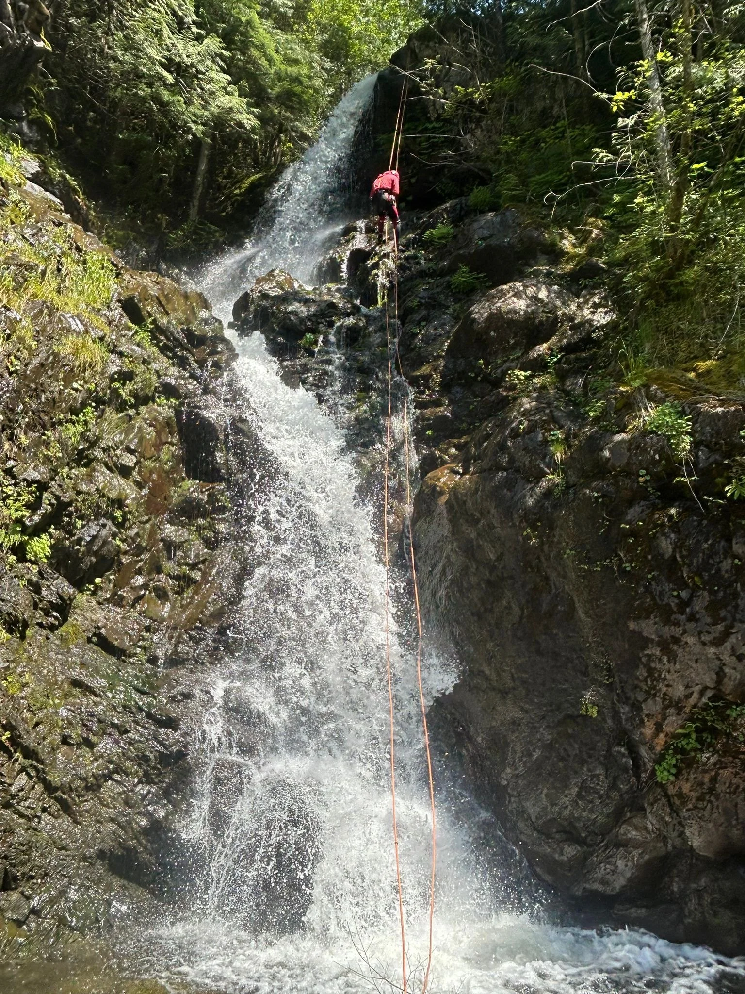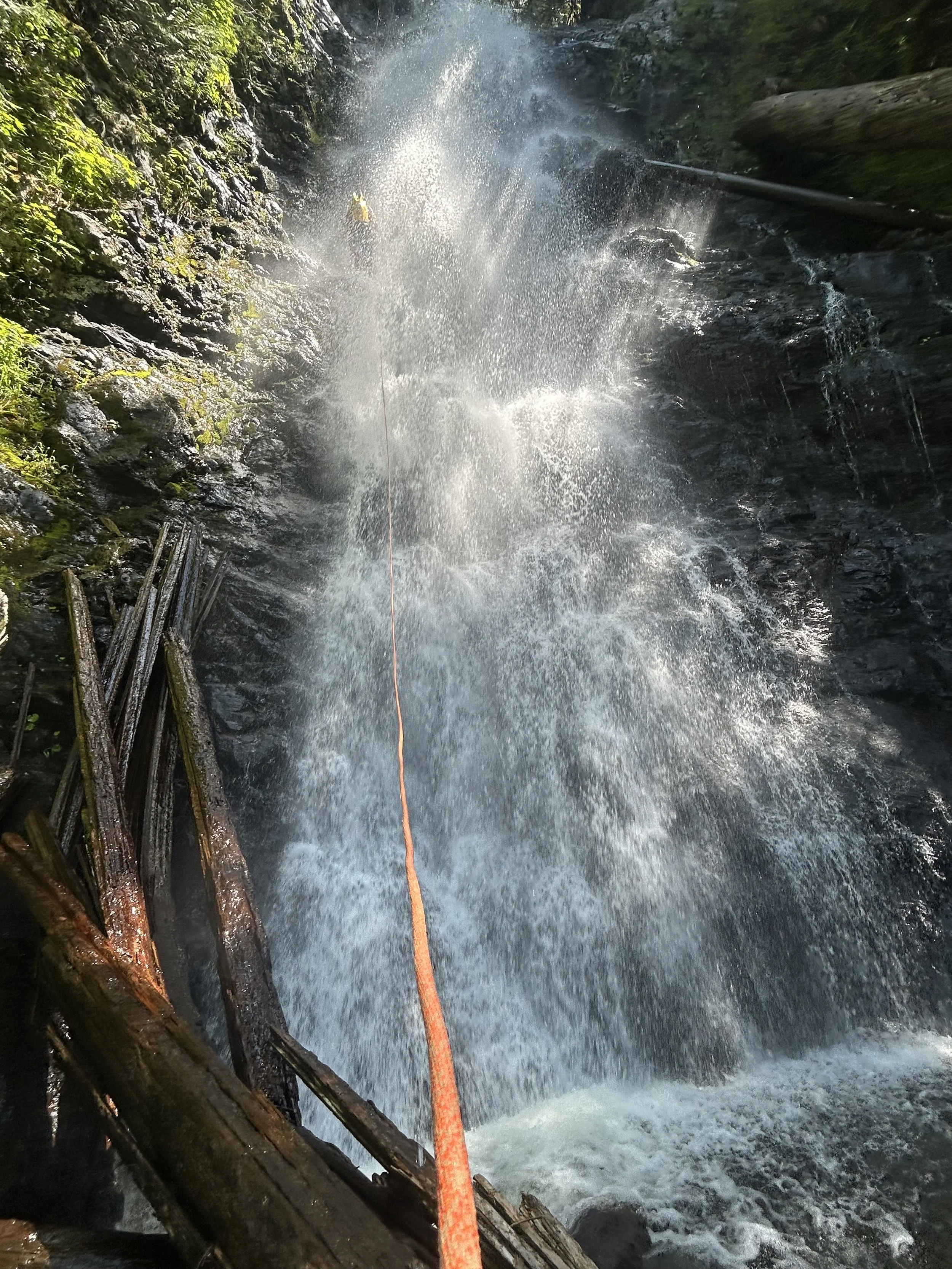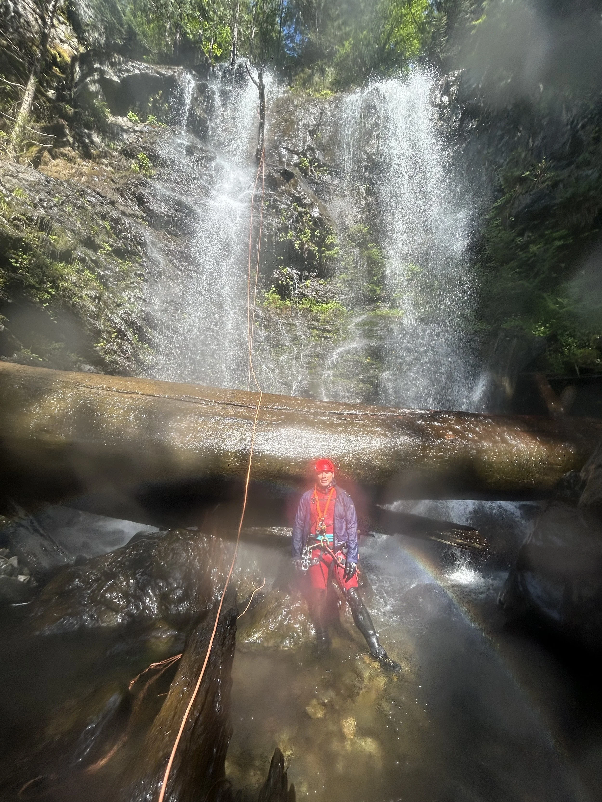 The final rappel between a split in the creek. Waterfalls on both sides during the rappel.