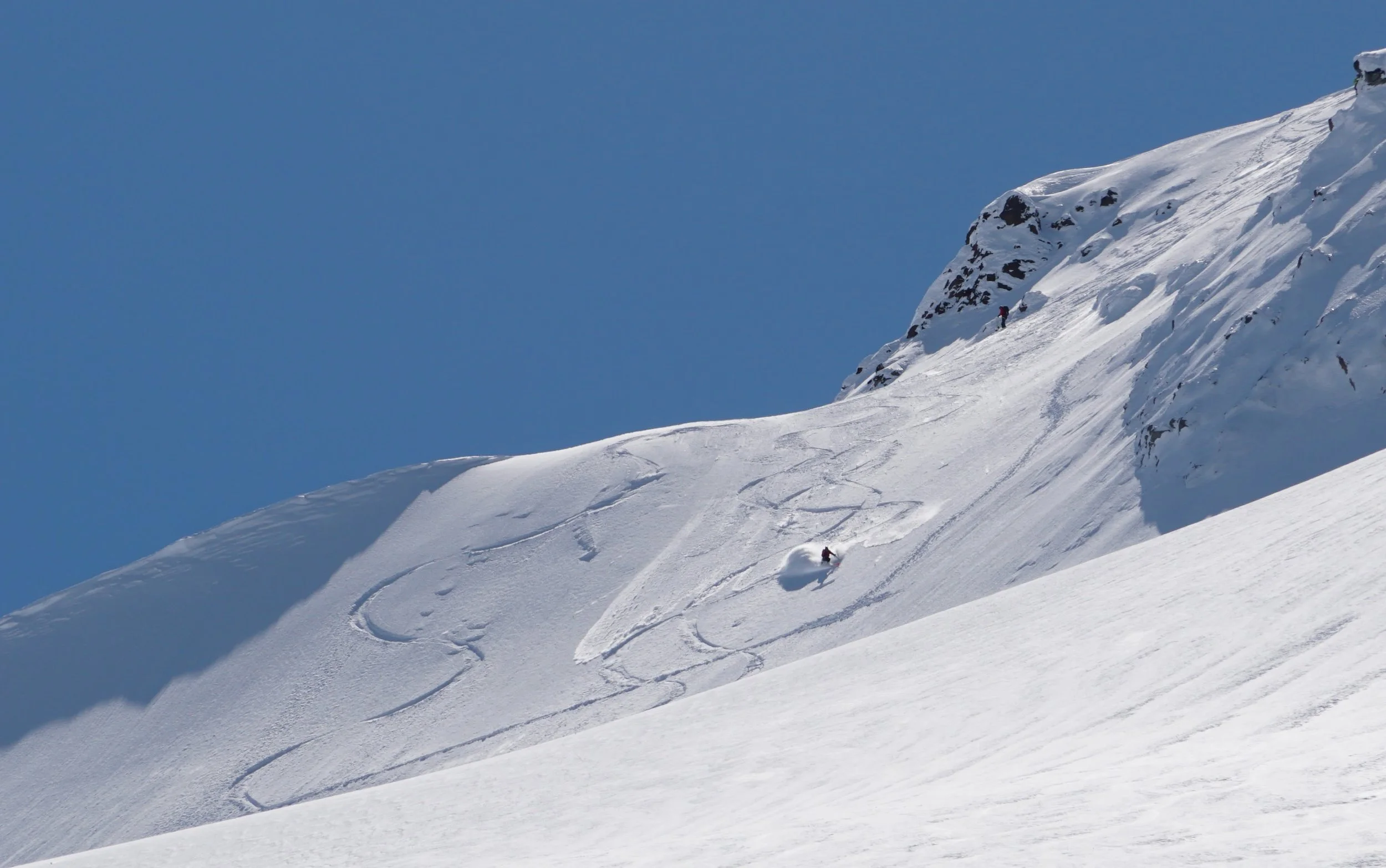 The skiing started out a tad bit spicy - The upper section of the face had a dusting of powder above an icy crust, it was slow skiing until the snow transitioned to boot top powder all the way down the face. They were fantastic turns.