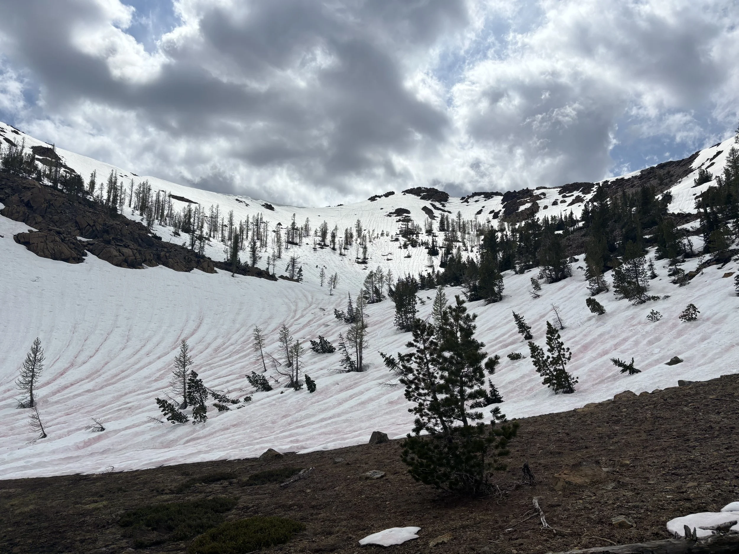 A nice descent through snow from Earl Peak. We slid down the gullies of watermelon snow.