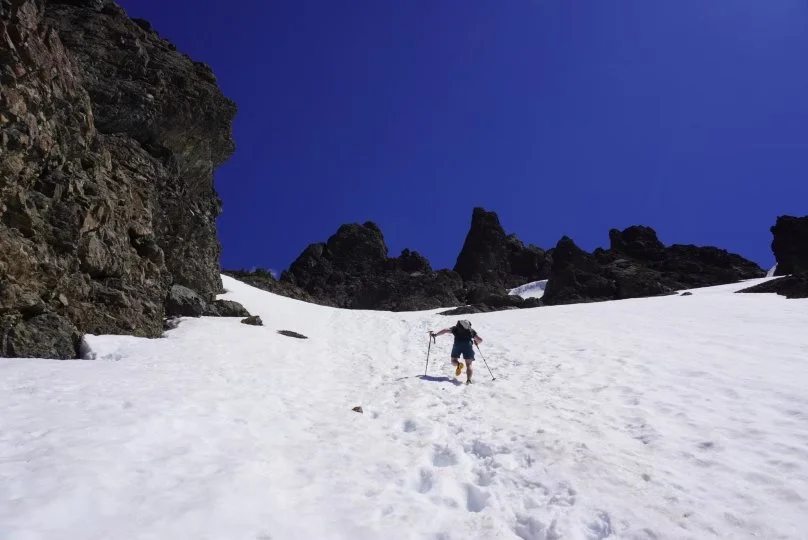 Above the burn, we ascended scree to a snow finger and then to a moderately angled snow slope, which took us just below the summit. We used our trail runners for the entire approach and decided crampons were unnecessary due to the soft snow. We had followed the boot path of another party, who had camped at the base the night before. We ended up passing them from afar on the way down, and Liz commented that it looked like one of the party members was a child…. Turns out it was in fact a 10 year old boy! Kudos to them and it is really special when you see a family tackling an outing like this.